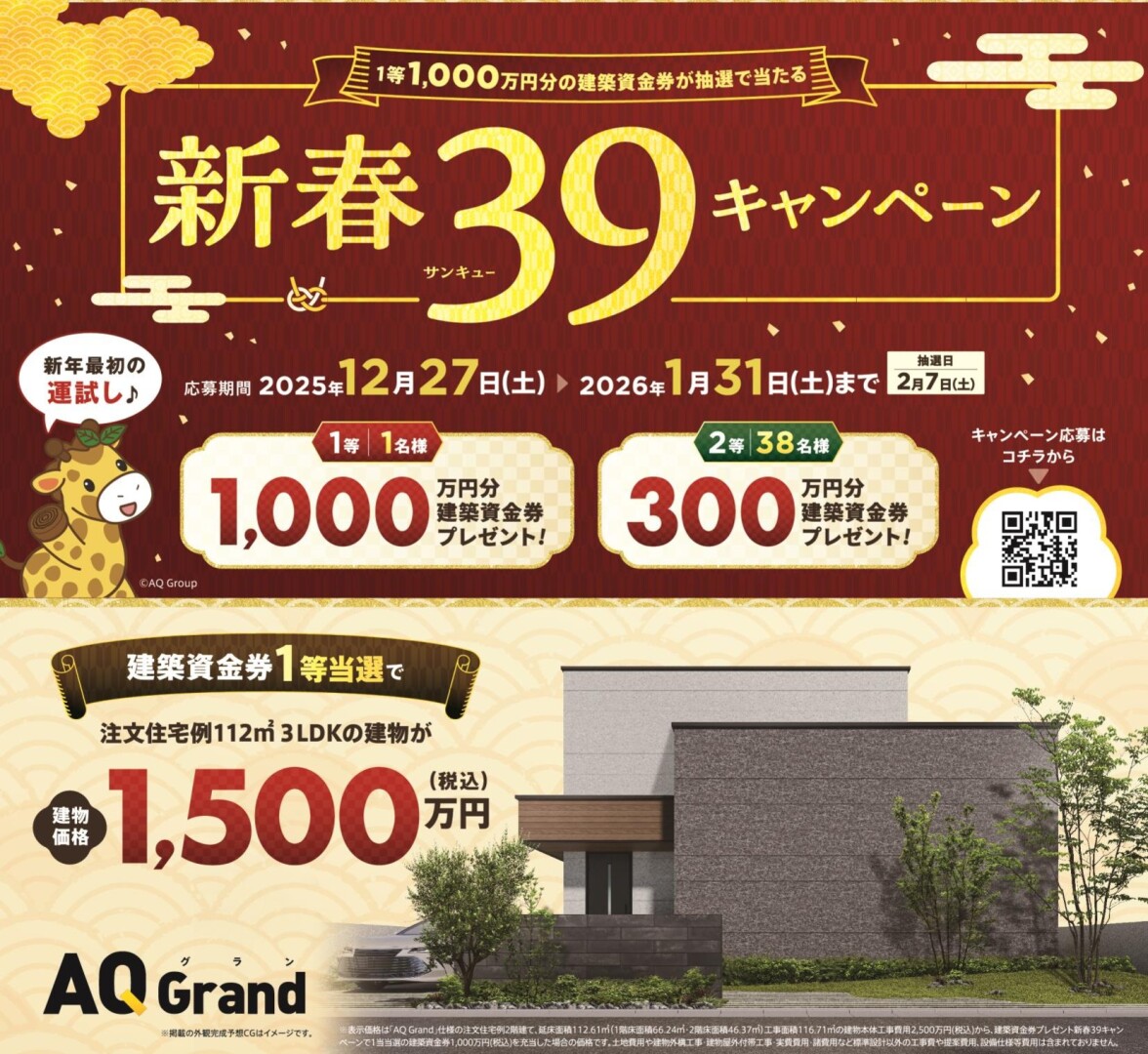 【アキュラホーム】新春39キャンペーン!抽選で建築資金券1000万円分が当たる♪