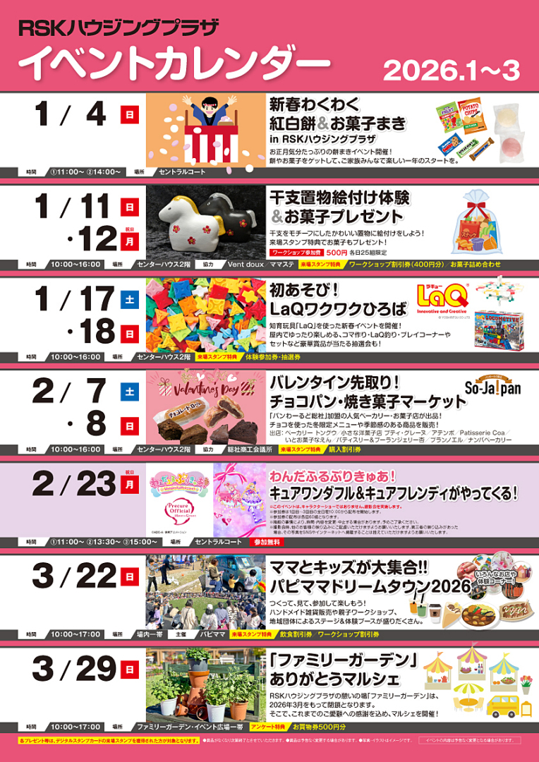 開催日 2026年1月1日~2026年3月31日 お知らせ イベントカレンダー【1月~3月】 RSKハウジングプラザで開催される、1月から3月までのイベント情報をカレンダーにまとめました。おでかけの計画や、ハウスメーカーとの打合せの計画にぜひお役立てください。 開催 2026年1月1日~2026年3月31日 TOPへ