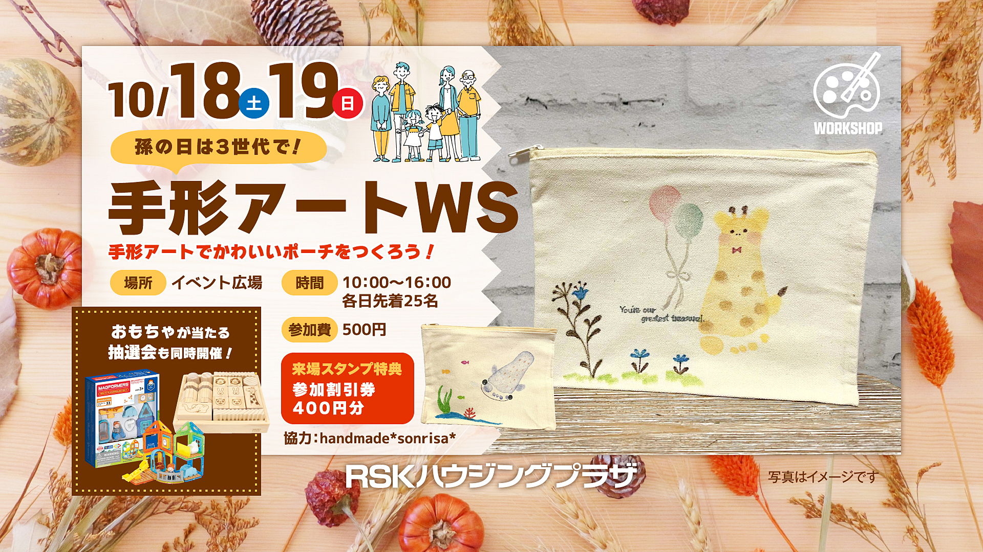 また、手形や足形を使ってかわいいイラストを作る「手形アート」が体験できるワークショップも同時開催!
