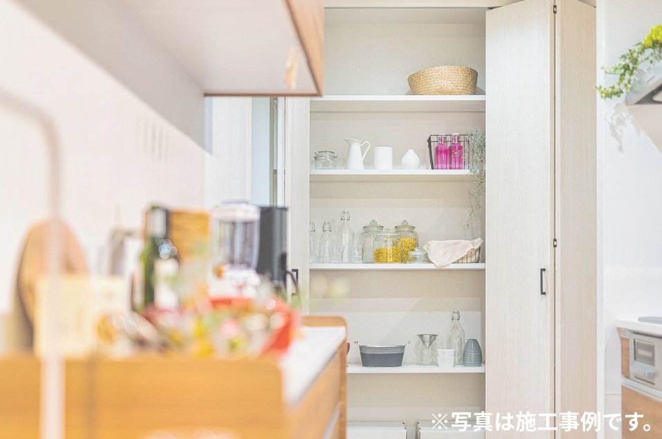 玄関横の広々シューズインクローク、キッチンには食器やストック品をたっぷりしまえるカップボード収納 、2階にはウォークインクローゼット と納戸。