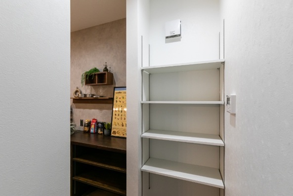 キッチン横には、食料品のストックや調理家電を隠して収納できる便利なパントリーを配置 。さらに、このパントリーを通って洗面所・浴室へと繋がる回遊動線を確保しました 。「料理をしながら洗濯機を回す」「お風呂の準備をする」といった家事の並行作業がスムーズに行え、毎日の家事負担を劇的に減らす工夫が詰まっています。