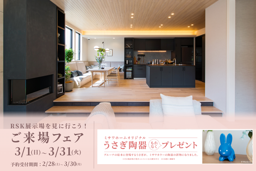 【キャンペーン要項】■キャンペーン内容:ミサワホームの住宅展示場に来場予約の上、ご来場いただいた方にミサワホームオリジナル「うさぎ陶器」をプレゼントいたします。■キャンペーン対象者:マイホームのご購入やご建築をお考えの方で、ミサワホーム㈱ホームページ「お近くのミサワホーム」から住宅展示場を来場予約の上、”はじめて”ご来場いただきアンケートにお答えいただいた方。※1家族1回とさせていただきます。■キャンペーン対象外の方:来場予約されていない方。当日予約の方。指定のミサワホーム㈱ホームページの来場予約フォーム以外から来場予約された方。リフォームをご相談の方。未成年や学生の方。既に当社あるいは他社とご契約いただいている方。その他の来場予約キャンペーンとの併用は不可。■実施期間:2026年3月1日(日)~3月31日(火)までのご来場が対象になります。■来場予約受付期間:2026年2月28日(土)~3月30日(月)■注意事項:予約状況によってはご予約日時等をご調整いただく場合がございます。商品は配布数が上限に達した段階で終了とさせていただきます。