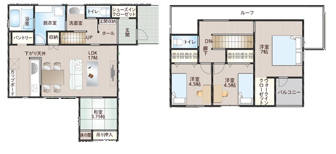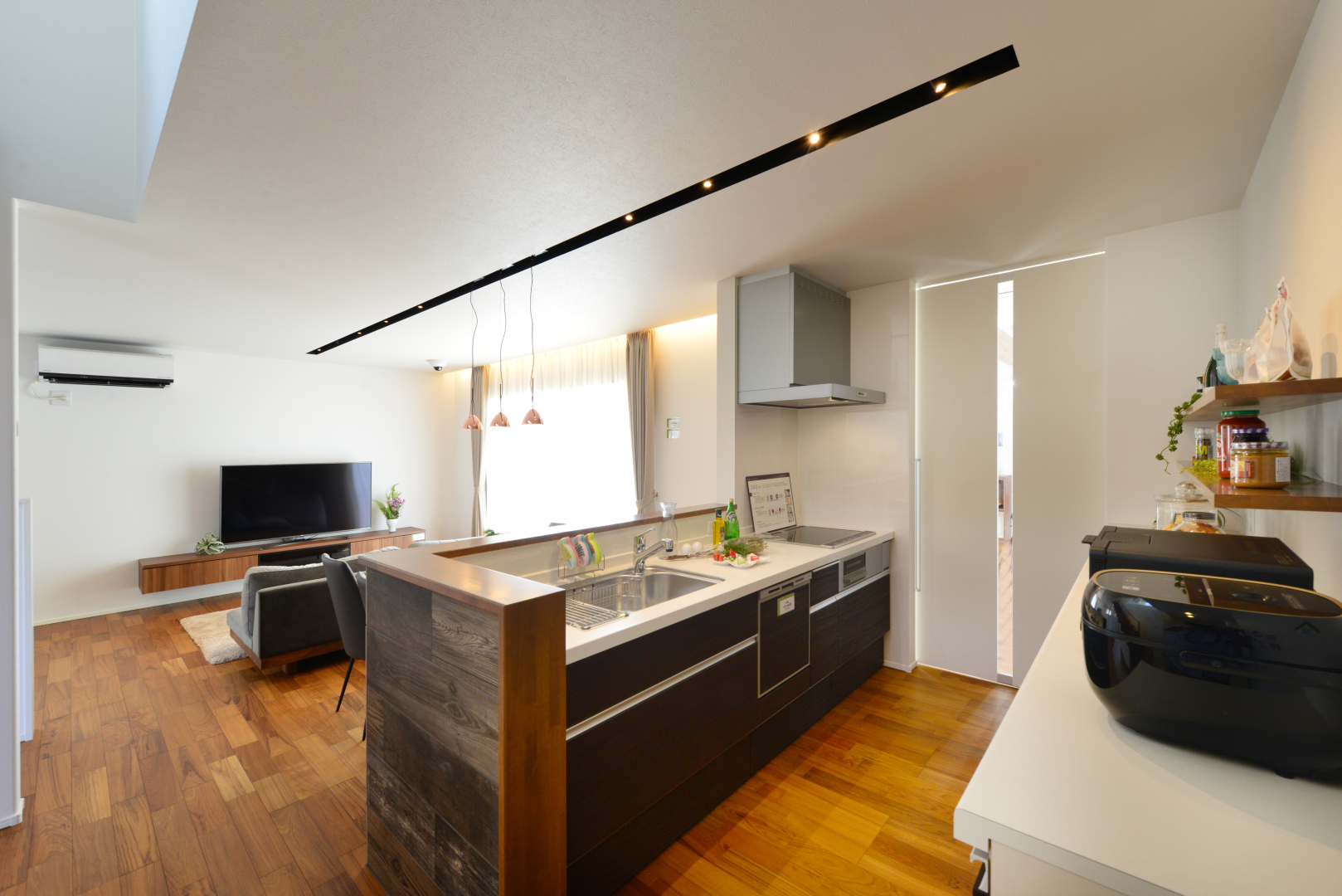 17帖の広々LDKと、キッチン横には、食料品のストックや調理家電を隠して収納できる便利なパントリーを配置。